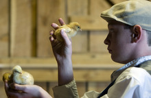 Volunteer Keegan Tureson holds baby chicks in the Savage Livery Stable during Baby Animal Season at This is the Place Heritage Park in Salt Lake City on April 1, 2013. The event will continue until May 24.