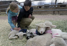 (left) Audrey Domyan and her mother, Sarah Domyan pet a baby lamb at the Petting Corral during Baby Animal Season at This is the Place Heritage Park in Salt Lake City on April 1, 2013. The event will continue until May 24.