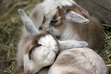 Two kids rest against each other in the Petting Corral during Baby Animal Season at This is the Place Heritage Park in Salt Lake City on April 1, 2013. The event will continue until May 24.
