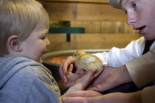 Volunteer Keegan Tureson holds a baby chick in the Savage Livery Stable during Baby Animal Seas