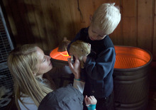 (left) Rachel and Isaac Lowry pet a baby rabbit in the Savage Livery Stable during Baby Animal Season at This is the Place Heritage Park in Salt Lake City on April 1, 2013.