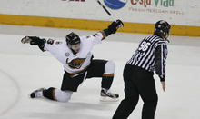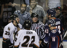 "Don't make me come over there." Grizzlies fans give Ontario Reign defensemean Matt Register some lip as the referee separates fighting players during second period play. After a scoreless second period, the Utah Grizzlies led the Ontario Reign 1-0 on forward Chris Donovan's first period penalty shot goal in Game 3 of the ECHL playoffs at the Maverick Center, Friday, April 5, 2013.