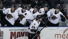The Utah Grizzly bench stands up to celebrate forward Chris Donovan's (#23) penalty shot goal to give the Grizzlies a 1-0 lead in Game 3 of the ECHL playoffs at the Maverick Center, Friday, April 5, 2013.