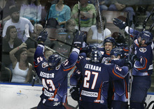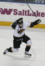 Grizzly forward Chris Donovan celebrates his first period goal on penalty shot to give