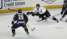 Grizzlies LW Ryan Howse gets tripped as he pursues the puck during second period play. After a scoreless second period, the Utah Grizzlies led the Ontario Reign 1-0 on forward Chris Donovan's first period penalty shot goal in Game 3 of the ECHL playoffs at the Maverick Center, Friday, April 5, 2013.