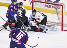 Utah Grizzlies goalie Shane Owen keeps his eye on the puck as Ontario Reign F Kyle Kraemer (#16) looks to rush in on the rebound during first period play. The Grizzlies led 1-0 after one period on forward Chris Donovan's penalty shot goal in Game 3 of the ECHL playoffs at the Maverick Center, Friday, April 5, 2013.
