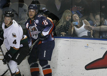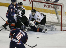 Utah goalie Shane Owen stones Reign F Kyle Kraemer during the second period. After a scoreless second period, the Utah Grizzlies led the Ontario Reign 1-0 on forward Chris Donovan's first period penalty shot goal in Game 3 of the ECHL playoffs at the Maverick Center, Friday, April 5, 2013.
