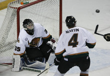 Grizzlies goalie Shane Owen keeps his eyes on a puck flying near the goal mouth during second periood play. After a scoreless second period, the Utah Grizzlies led the Ontario Reign 1-0 on forward Chris Donovan's first period penalty shot goal in Game 3 of the ECHL playoffs at the Maverick Center, Friday, April 5, 2013.