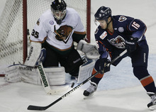 Utah Grizzlies goalie Shane Owen (35) keeps his eye on the puck as Ontario Reign's Kyle Kraemer (16) looks to rush in on the rebound during first period play in Game 3 of the ECHL playoffs at the Maverick Center, Friday, April 5, 2013, in West Valley City, Utah. (AP Photo/The Salt Lake Tribune, Scott Sommerdorf) DESERET NEWS OUT; LOCAL TV OUT; MAGAZINES OUT