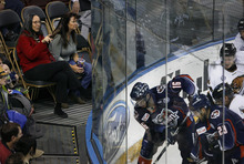 Grizzlies fans keep track of the action as the puck goes into the corner during a scoreless second period. The Utah Grizzlies led the Ontario Reign 1-0 on forward Chris Donovan's first period penalty shot goal in Game 3 of the ECHL playoffs at the Maverick Center, Friday, April 5, 2013.