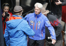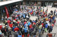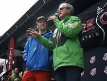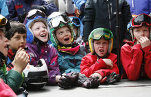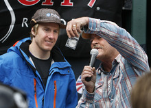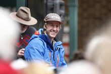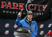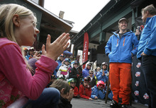 The celebration got under way when members of the youth Park City Ski Team carrying the flags of some 60 countries descended in wide arcs to the bottom of Pay Day run. They were followed by Ligety, who wore a robin's-egg-blue helmet and jacket and orange pants. He skidded to a stop in front of a large crowd who clapped and cheered as he carried his skis to a stage at Pay Day Plaza.
