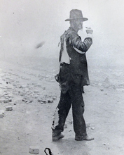 Children play in the ashes and rubble while Park City continues to smolder in the background following the fire of 1898.