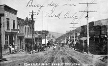 Lower Main Street in Park City showing shoppers out and about. Prior to the 1898 fire.