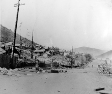 Pedestrians walk past the remains of Park City's City Hall, with Marsac Mill in the background, after the 1898 fire.