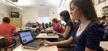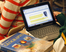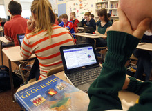 Talbot's students use netbooks to access a variety of digital materials. Traditional geography textbooks sat under their desks on a recent day, but students never referred to them and the books remained behind when the bell rang. Instead of providing each student with a textbook, Talbot simply has one classroom set.