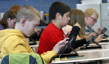 That's because at his school, North Davis Junior High in Clearfield, students often use online texts on iPads and netbooks. Textbooks still line classroom shelves, but, to students, they're just one of many resources, not tomes to be pored over every night, hauled back and forth from home.