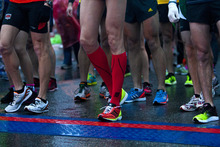 Several American flags bobbed up and down in the tight throng of runners, and many wore green in honor of the city with strong Irish heritage. Many also donned T-shirts, blue ribbons and bracelets, bearing the words "Run for Boston" that were passed around at the start.