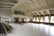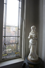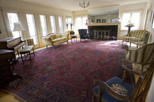 My tour offered a rare chance to see the building's interior, with its functional theater, big kitchen, elegant stairways and beautifully preserved furniture, including vintage oak tables, a baby grand piano and a writing desk. The leaded glass windows sparkle with tiny squares of stained glass.