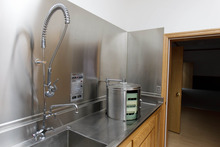 A commercial dishwasher and sink in the kitchen of a home intended for the family of Warren