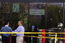 About a half-dozen bullet holes riddled the outside glass windows of the police department.