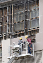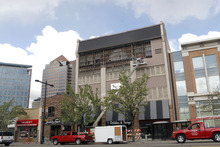 Workers on a lift remove the facade from a building at 150 South State St. to reveal the his