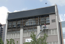 Workers on a lift remove the facade from a building at 150 South State St. to reveal the historic front underneath.