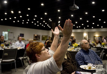 Vickie Fuller holds her hand in the air and sings along Thursday during a worship service for the 62nd National Day of Prayer at Calvary Chapel of Salt Lake. The event featured live-streaming video from the National Day of Prayer event, a free breakfast and a worship service.