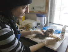 Volunteer Jennifer Jaramillo has already warmed a bottle and preps a soft, clean spot to work with a week-old white and gray-striped kitten. Soon she gently wrangles the little one as it twists its face away from the dropperful of supplements she tries to administer.