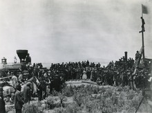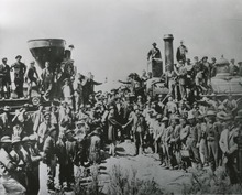 This is the most famous photograph taken of the "Last Spike" Ceremony at Promontory, May 10, 1869, w