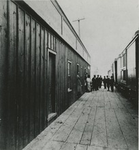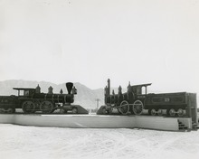This is the most famous photograph taken of the "Last Spike" Ceremony at Promontory, May 10, 1869, with Central Pacific locomotive "Jupiter", CP No. 60, a wood-burner, on the left, and Union Pacific locomotive No. 119, a coal-burner on the right. The engineers of these two locomotives are on the pilots holding bottles of champagne which were later broken over the nose of each locomotive. Standing in the center shaking hands are the chief engineers of the two roads, Sam S. Montague of the Central Pacific (left) and General Dodge of the Union Pacific (right).