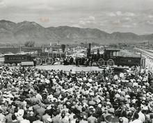 This photo from May 10, 1965, shows an event celebrating the completion of the Transcontinental Railroad at Promontory Summit, Utah. The railroad was completed on May 10, 1869.