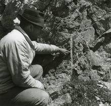 In this photo from May 3, 1964, J. Dale Madsen, of Brigham City, examines drill holes made by hands of railroa