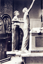 A young boy stands next to a statue to be placed on the Salt Lake City and County Building on 400 S. State St. The building was originally constructed by Freemasons between 1891 and 1894. Construction of the building was riddled with controversy. During the late 19th and early 20th centuries the City and County Building was the symbol of non-Mormon citizens' open defiance of The Church of Jesus Christ of Latter-day Saints. It was designed to rival the Salt Lake Temple as the city's architectural centerpiece. It is even thought that the building's clock tower and statues were designed to mimic the temple's spires and statue of the angel Moroni.