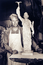 Artist Richard Young with a scale model of the statue "Columbia" placed on top of the Salt