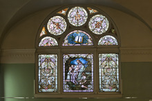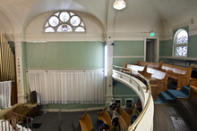 Features • Arched entry, carved pieces of sandstone trim, red brick exterior, curved pews, white columns supporting the gallery