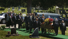 LDS Church President Thomas S. Monson, family and friends are assisted to the gravesite of his wife, Frances J. Monson, who was laid to rest in the Salt Lake City Cemetery, Thursday, May 23, 2013. Frances Monson died Friday at age 85 after having been hospitalized for several weeks. The Utah-based Church of Jesus Christ of Latter-day Saints said she died of causes incident to age.