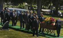 Monson family members remove their boutonnieres to place on the casket of Frances J. Monso