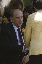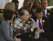 LDS Church President Thomas S. Monson is greeted by a loved one at the gravesite of his wife, Frances J. Monson, who was laid to rest in the Salt Lake City Cemetery, Thursday, May 23, 2013. Frances Monson died Friday at age 85 after having been hospitalized for several weeks. The Utah-based Church of Jesus Christ of Latter-day Saints said she died of causes incident to age.