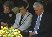 President Dieter F. Uchtdorf and his wife, Harriet Reich Uchtdorf, pray at the gravesite of Frances J. Monson, wife of LDS Church President Thomas S. Monson, who was laid to rest in the Salt Lake City Cemetery, Thursday, May 23, 2013. Frances Monson died Friday at age 85 after having been hospitalized for several weeks. The Utah-based Church of Jesus Christ of Latter-day Saints said she died of causes incident to age.