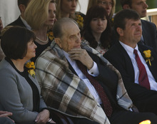 LDS Church President Thomas S. Monson gladly eases into the blanket placed around his shoulders by his daughter, Ann Dibb, and son Clark S. Monson at the gravesite of his wife, Frances J. Monson, who was laid to rest in the Salt Lake City Cemetery, Thursday, May 23, 2013. Frances Monson died Friday at age 85 after having been hospitalized for several weeks. The Utah-based Church of Jesus Christ of Latter-day Saints said she died of causes incident to age.