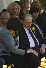 LDS Church President Thomas S. Monson is comforted by his daughter, Ann Dibb, at the graves