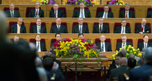 The casket of Frances J. Monson, wife of Thomas S. Monson, president of The Church of Jesus Christ of Latter-day Saints, sits in the Salt Lake Tabernacle during funeral services on Thursday May 23, 2013.