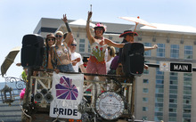 Many companies were represented in the parade: AAA, Smith's (which had a line of rainbow-flag-draped shopping carts), Petco, Chase and Wells Fargo (with an old western stagecoach pulled by horses), among others.