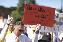 Another smaller contingent of churchgoing, straight Mormons marched under the banner Mormons for Equality, which take a more progressive stance in supporting gay marriage.