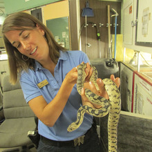 There she works with more than 60 animals representing 20 different species, including some venomous snakes and lizards. She said that part of the job "kind of freaked my mom out."