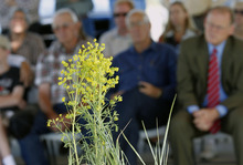 Blackham spoke in front of a bucket holding Wasatch County's worst enemy: leafy spurge.