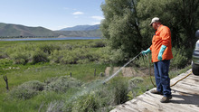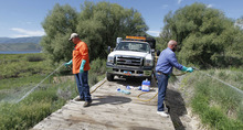 Smith said counties can use natural weapons, like beetles, goats and sheep, which eat the plants. But attendees and organizers used a Heber Valley Railroad train loaded with a truck and 250-gallon chemical tank to spray herbicide on leafy spurge and poison hemlock along the railway north of Deer Creek reservoir.