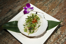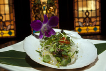 An asparagus salad ($8) was delicious enough to forgo any debates over authenticity. It included a perfectly poached egg atop a couple fistfuls of thin, grilled asparagus, and was finished with cherry tomatoes and a miso vinaigrette.