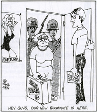 For example, Bagley's first cartoon lampooned BYU's fight over federal Title IX policies mandating coed housing. He portrayed National Guardsmen bringing in a young woman as a new roommate in previously all-male housing. Benson said students were not angered by the cartoon's message but the fact that Bagley had placed a poster of bikini-clad Farrah Fawcett on the wall.