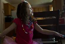 She and Lucy sit at a kid-sized table and chair in the living room and begin with a calming, counting exercise to signal that it's time to learn.